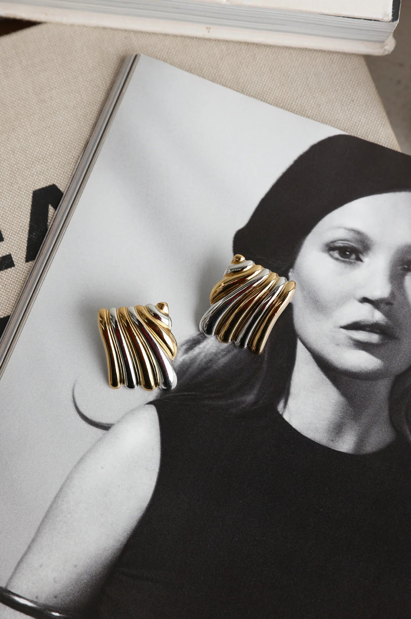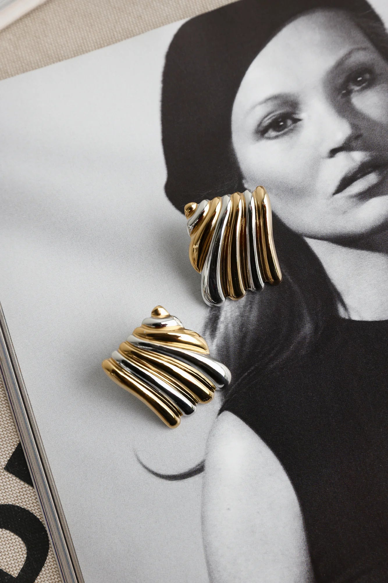 Give your look an editorial edge with the Behind The Scenes Earrings. Featuring sculptural ridges in mixed gold and silver tones, these earrings bring a bold, high-fashion feel to any outfit.