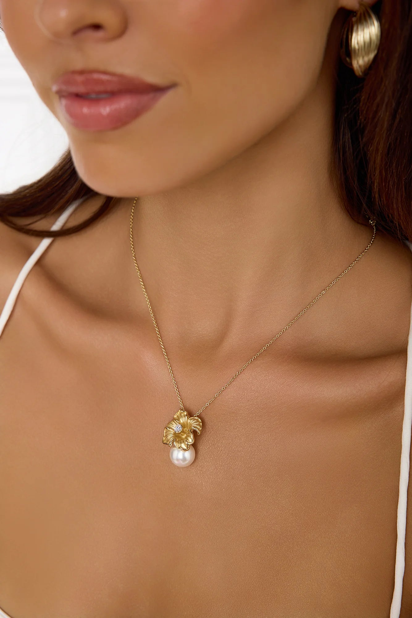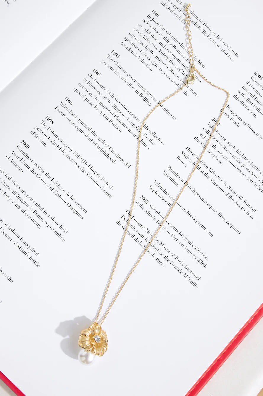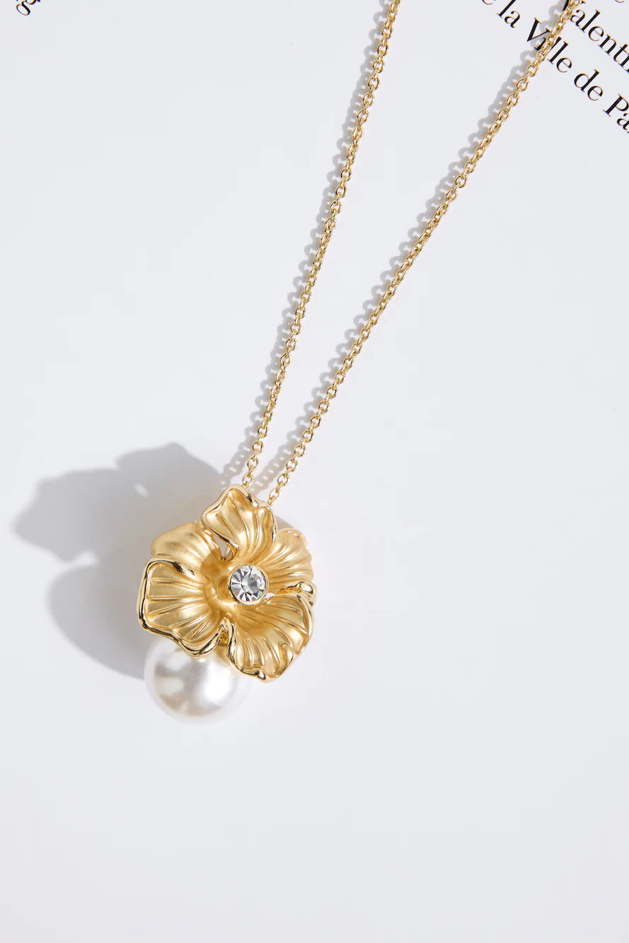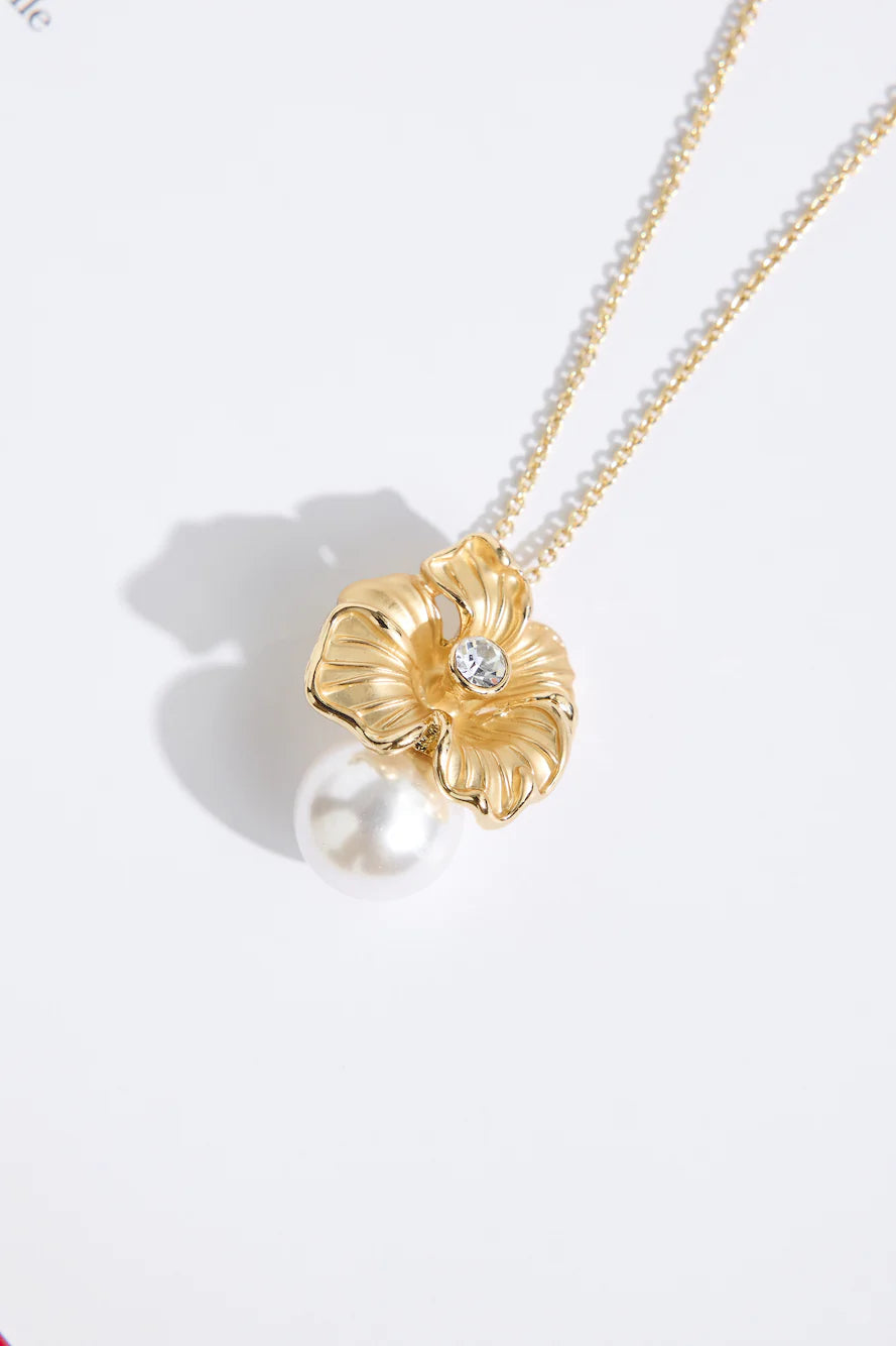 The Flower Friend Necklace features an 18k gold-plated finish with a delicate flower pendant and a faux pearl accent, adding a touch of elegance. Complete with a lobster closure and extender for the perfect fit.