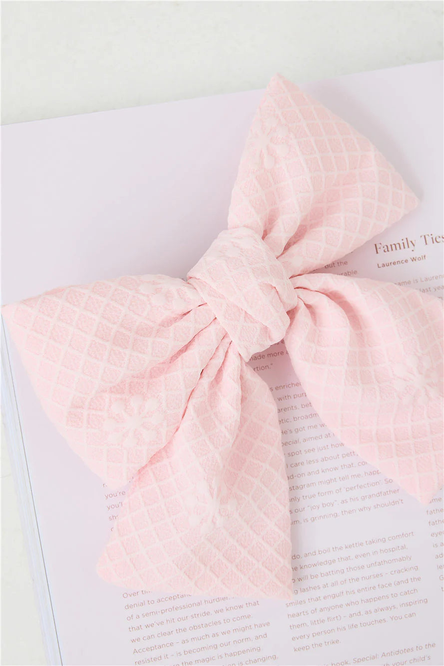 Add a touch of charm to your hairstyle with the Pretty Girl Bow Hair Clip in a soft pink hue. Featuring a textured design, this sweet accessory combines elegance and playfulness. The sturdy barrette clip ensures a secure hold, making it perfect for everyday wear or special occasions.