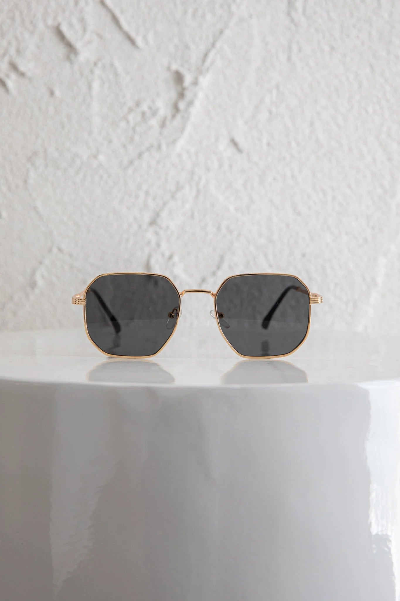 Turn heads in our classic Sahara sunglasses. Featuring black-tinted lenses and a gold frame. Perfect for sunny weekends, team them with mom jeans and a vintage band tee for an on-trend look.