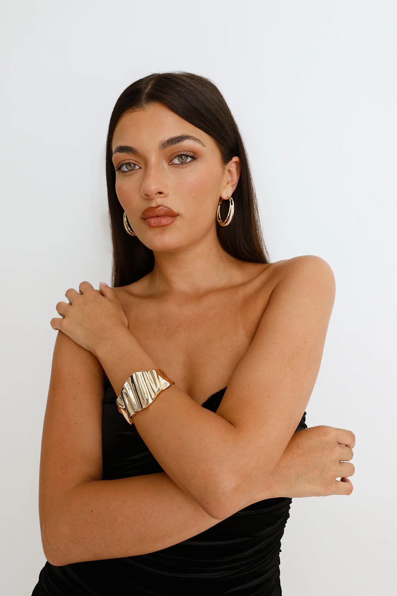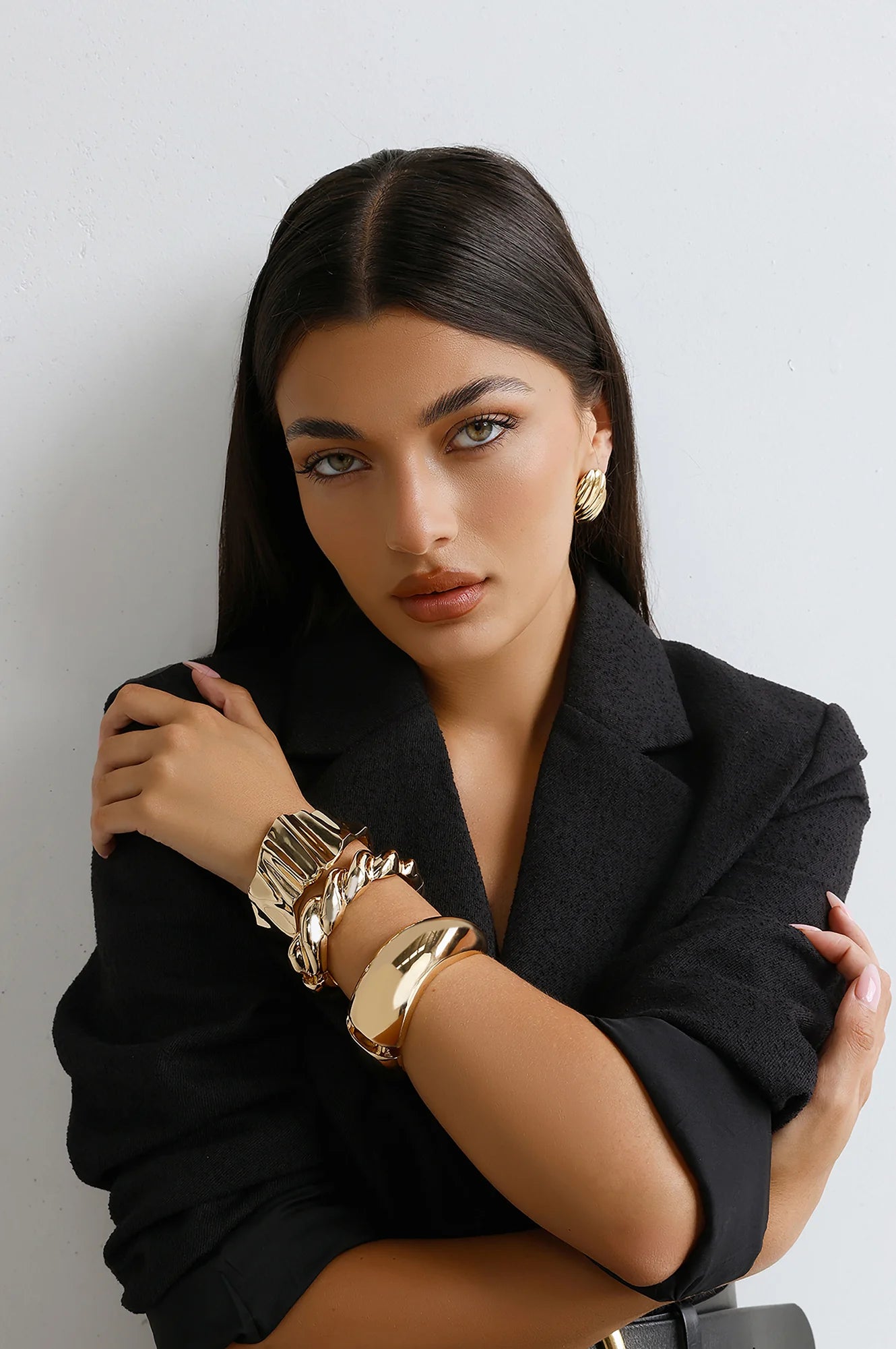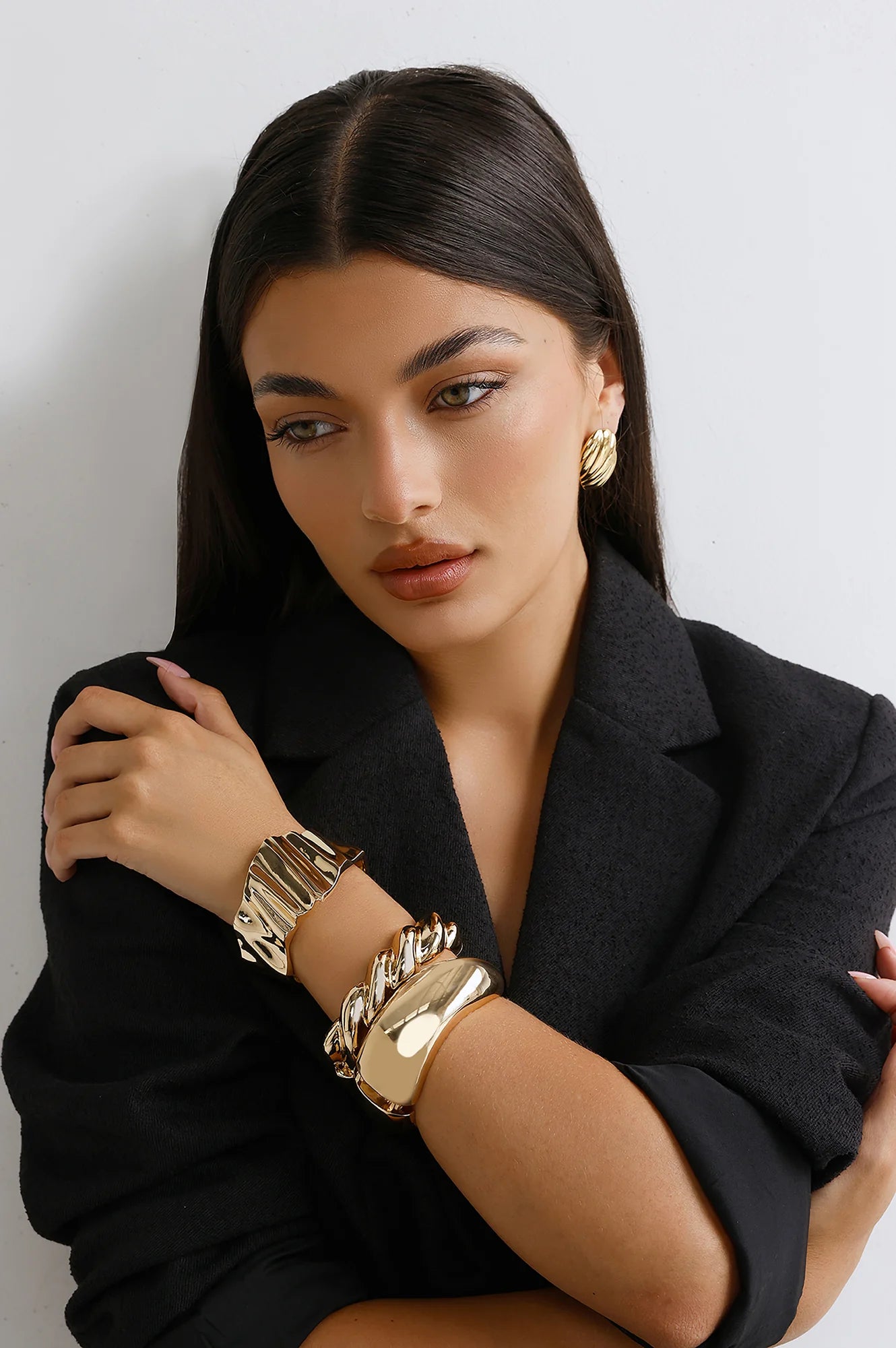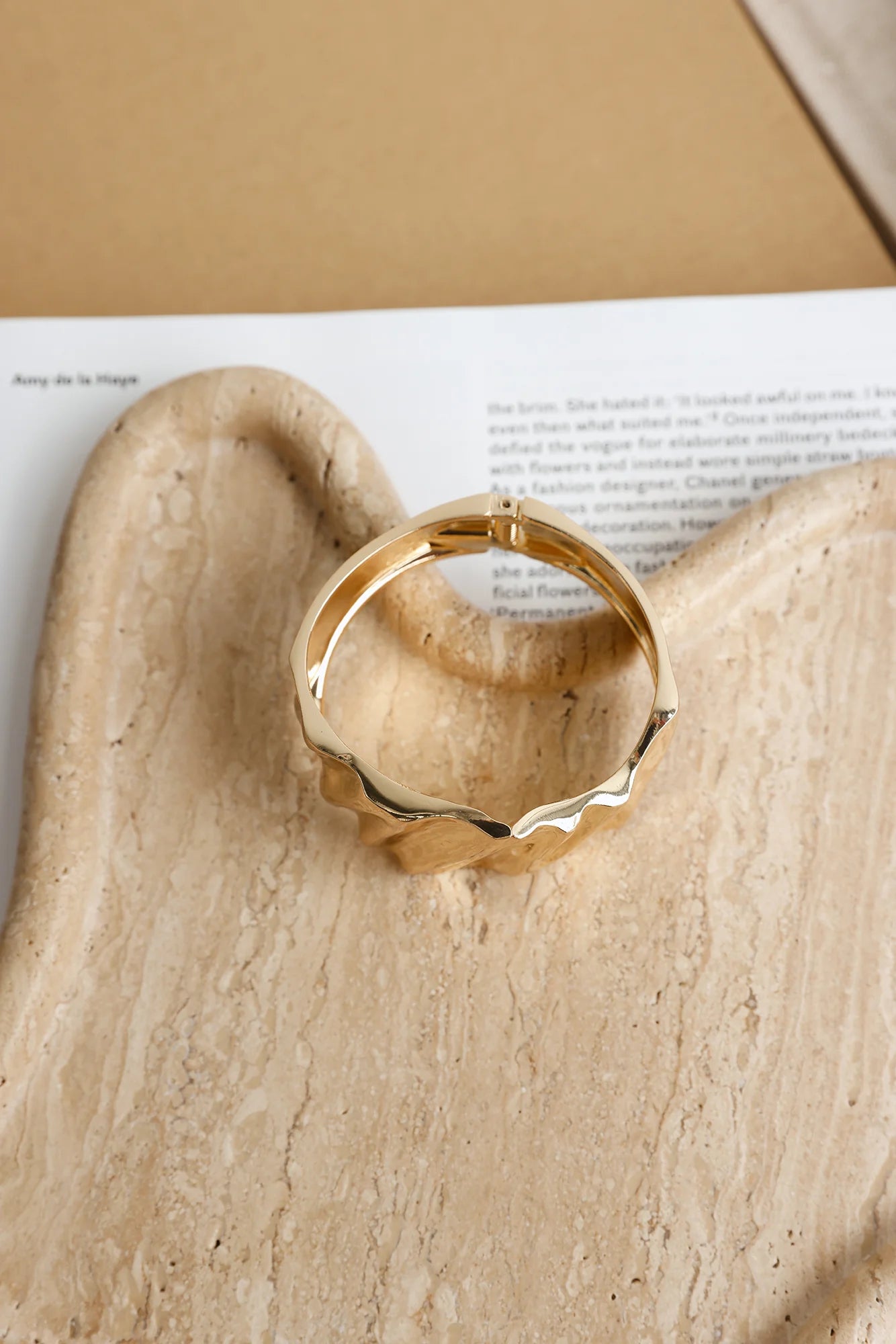 The Stephanie Bangle is an elegant cuff with a wavy design. Featuring a secure hinge closure, this bangle offers a sophisticated and contemporary look that complements any outfit.